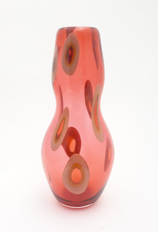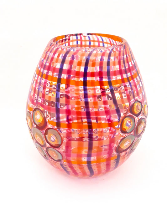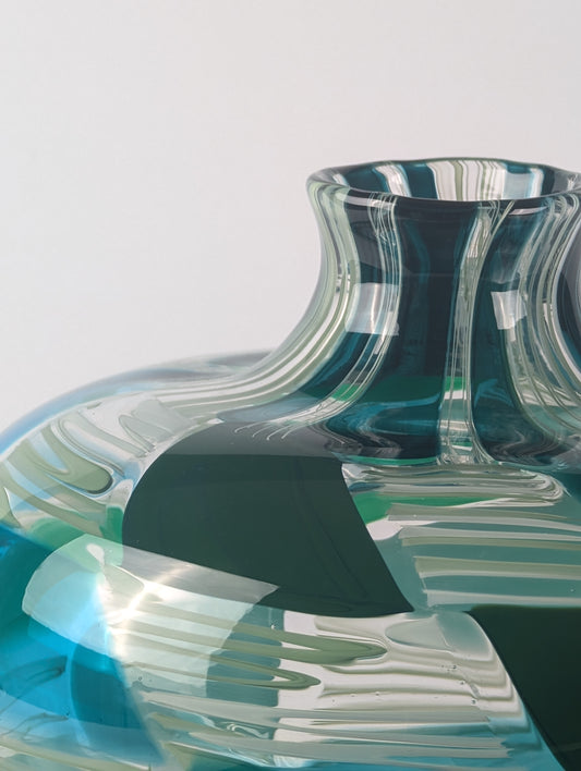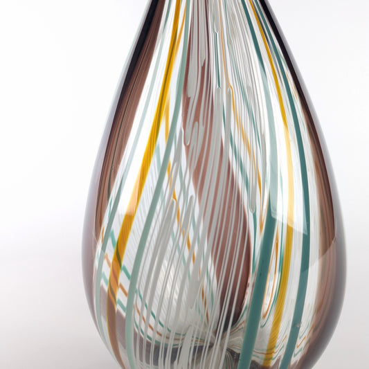 My artistry in blown glass draws inspiration from vintage color aesthetics which I interpret into glass colors that are hand pulled into glass canes, ribbons and murrini. From these elements, bold patterns are shaped into forms converging them seamlessly into a unified concept.